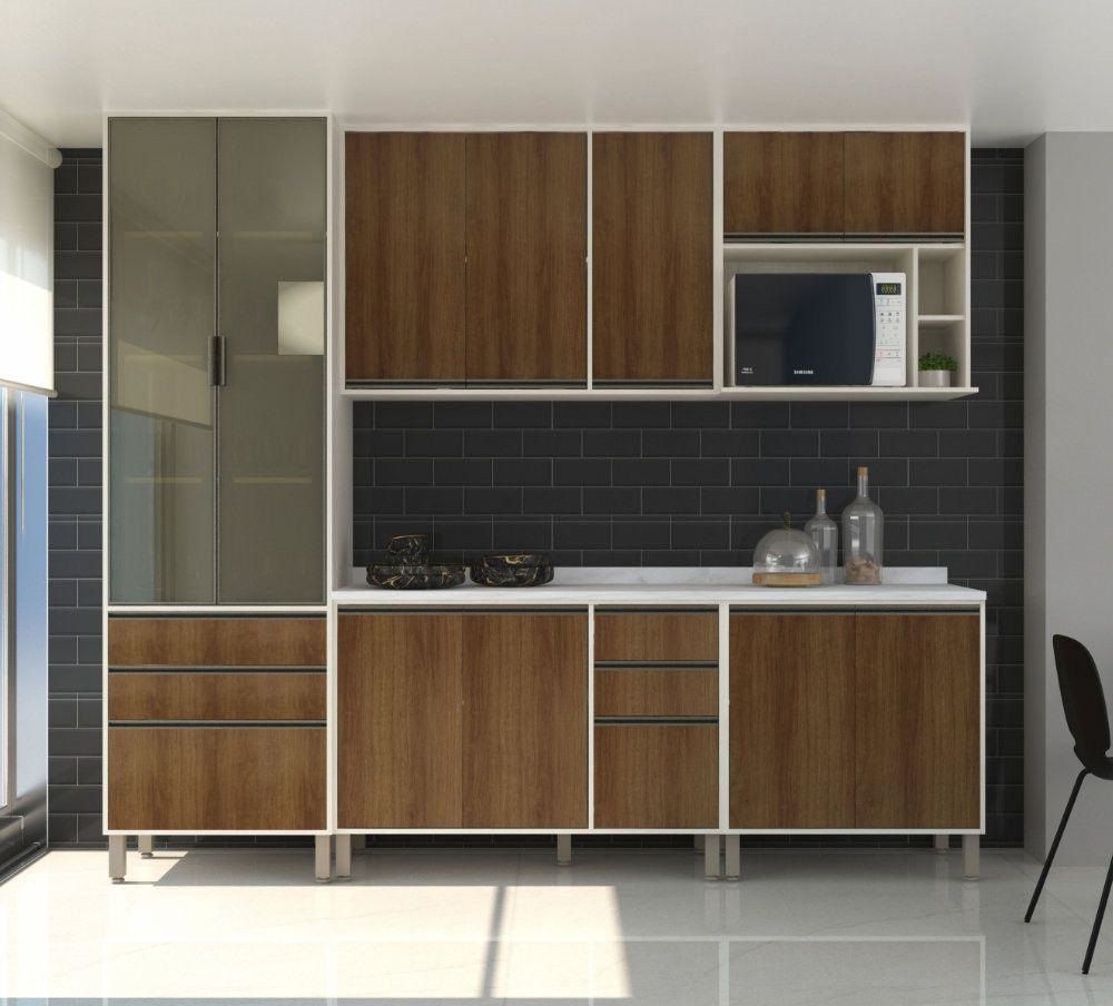 Uma cozinha modulada linda, completa, para deixar seu ambiente super aconchegante e requintado. Composta por 5 peças cuidadosamente pensadas para sua organização. Os armários aéreos são mais altos com 85cm e mais profundos com 33cm, mais espaços para acomodar e organizar. Os balcões possuem 89,5cm de altura, melhor ergonomia para maior conforto no uso diário. As portas embutidas trazem sofisticação ao ambiente, com acabamento impecável. Conta com acessórios requintados como: Dobradiças Slowmotion, com amortecedor incorporado para fechamento suave das portas, puxadores tipo gola em perfil alumínio na cor inox com ponteira de acabamento para proteção contra acidentes, corrediças metálicas telescópicas em três estágios para abertura total das gavetas e pés em Poliestileno na cor Champagne. O Paneleiro Torre contém portas com moldura em alumínio com vidros reflecta na cor bronze, balcões com tampos e espaço para micro-ondas, para manter tudo no lugar. Destaque para altura de 236 cm aproveitando o máximo de espaço disponível em seu ambiente. Os módulos são montados individualmente e permite a instalação da forma que melhor se adeque ao seu espaço. Para este ambiente utilizamos como proposta 270cm de parede linear.