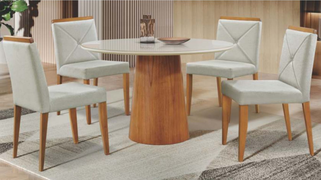 Cor: Mesa tampo em vidro na cor off-white. / Base cor Imbuia. Cadeiras cor da madeira Imbuia e assentos tecido linho creme.