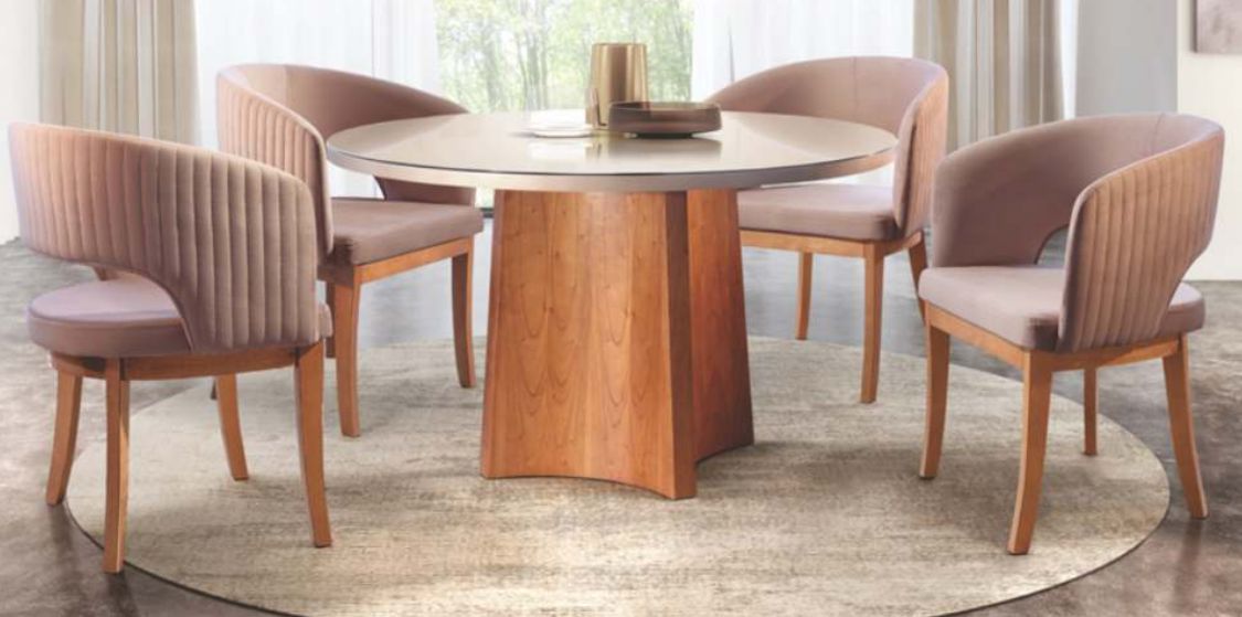 Cor: Mesa tampo em vidro na cor off-white. / Base cor Imbuia. Cadeiras cor da madeira Imbuia e assentos tecido veludo Rosê.
