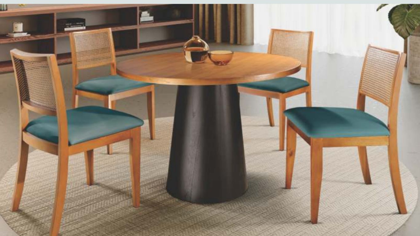 Cor: Mesa tampo cor da madeira Imbuia / Base Preta. Cadeiras cor da madeira Imbuia e assentos tecido veludo esmeralda.